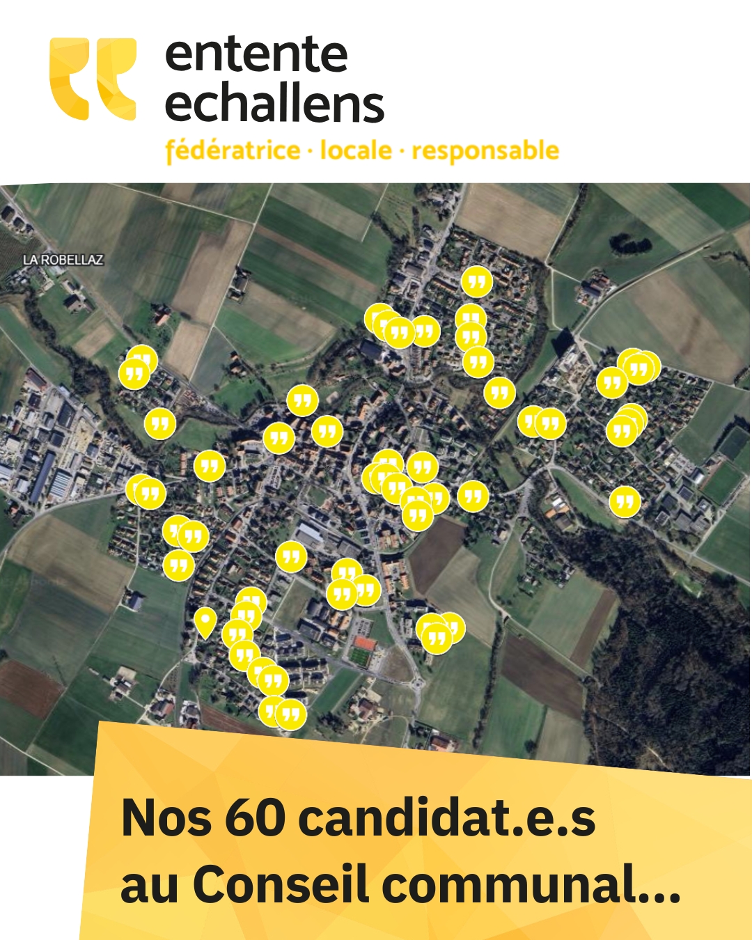 L’entente est en campagne pour les élections communales du 8 mars 2026. Nous présentons 4 candidat·e·s pour la Municipalité et une liste complète de 60 personnes à la candidature du Conseil communal. Suis-nous sur les réseaux au fur et à mesure du déroulement de la campagne !