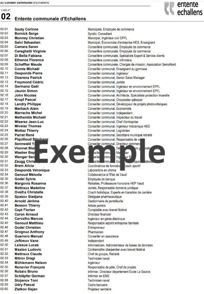 • En cochant simplement nos quatre candidat.e.s à la Municipalité et en glissant la liste n°2 pour le Conseil communal  (voir les exemples ci-dessous).